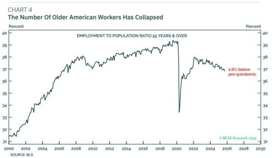 BCA Research的报告揭示了一个被市场忽视的重要结构性变化:美国劳动力市场中老年工人的持续减少。报告称,疫情以来,美国出现了约250万的“超额退休”现象。这背后有两个主要原因:一是老年群体在疫情中更为脆弱,二是股市的强劲上涨为他们提前退休创造了财务条件。