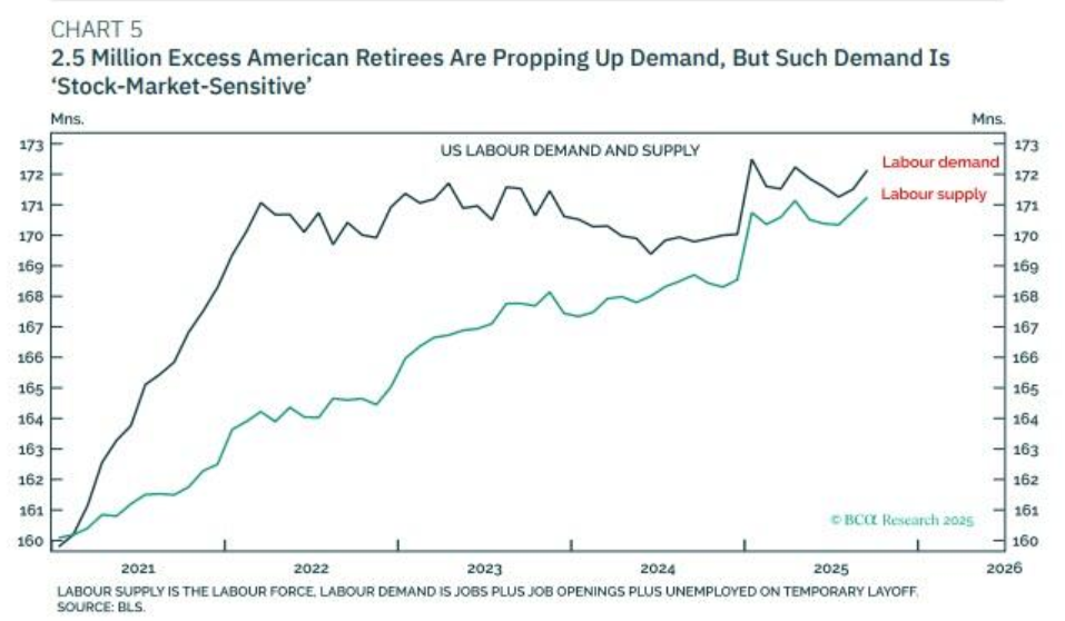 BCA Research在报告中明确指出,当前美国经济的一个关键支撑来自于约250万“超额退休”人群的消费支出。这部分人群因新冠疫情后的股市繁荣而提前退休,他们的消费能力与股市表现直接挂钩,形成了一个“对股市敏感”的需求侧。